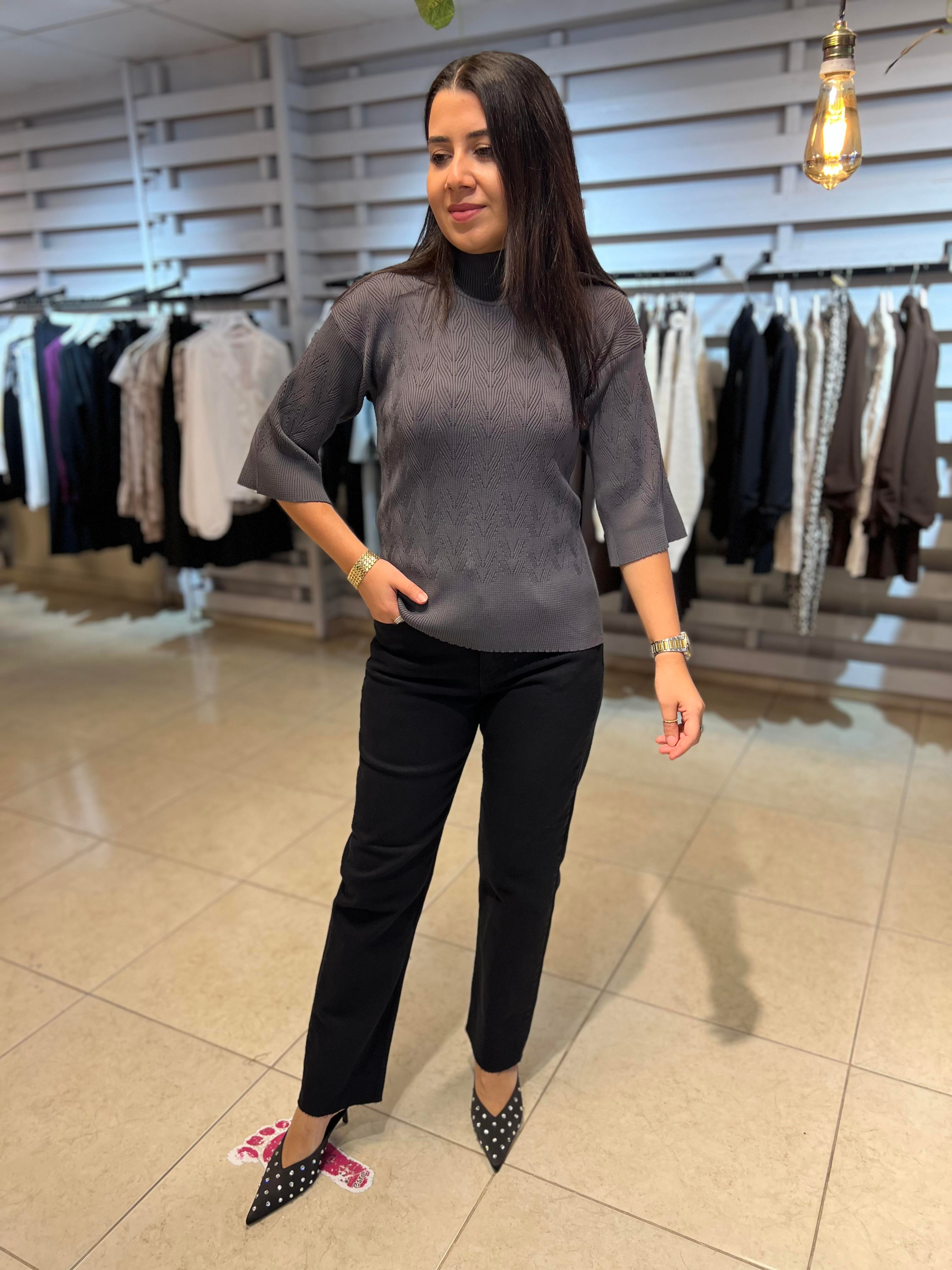 Ajurlu Yarım Balıkçı Triko Bluz Gri
