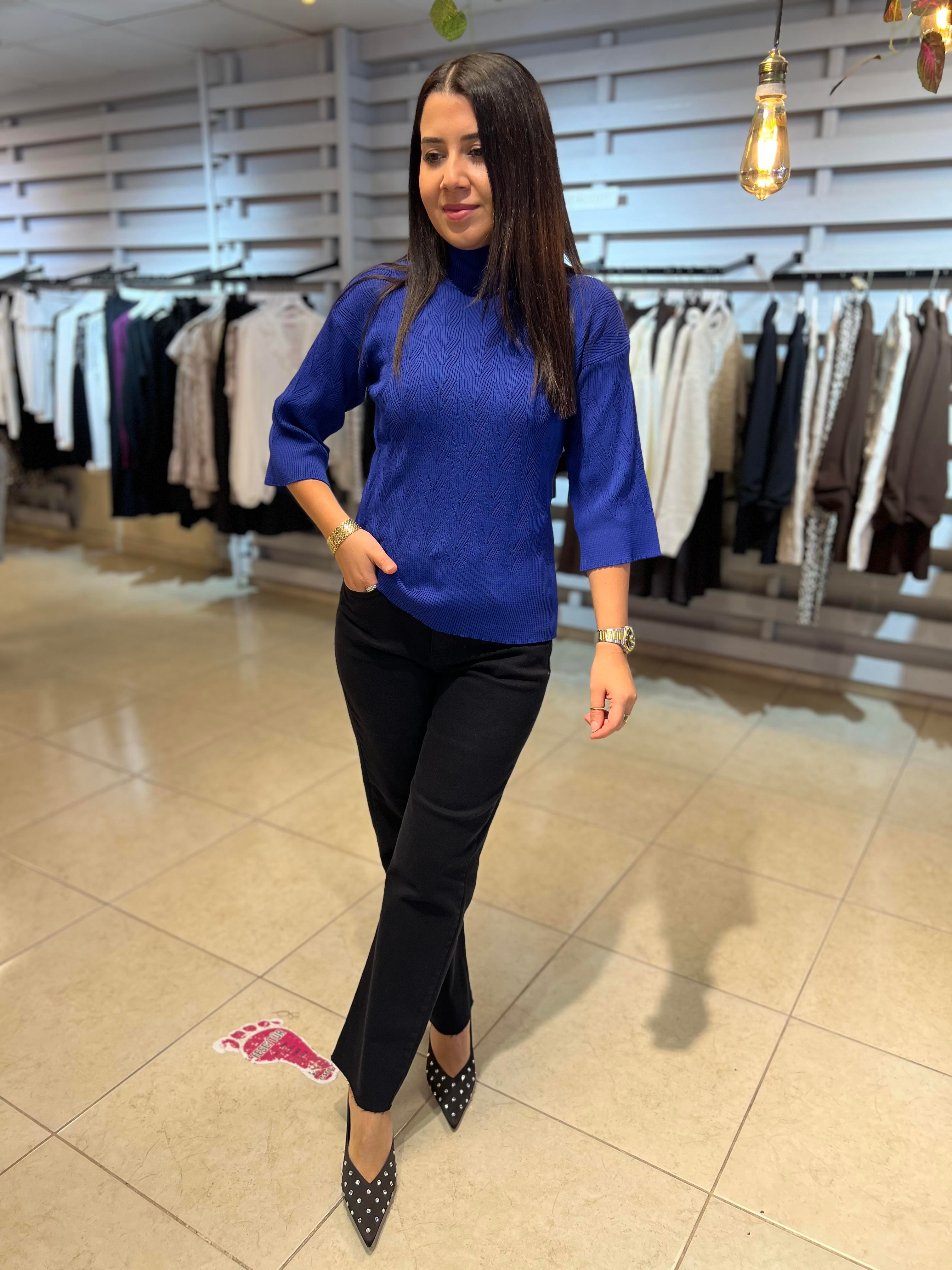 Ajurlu Yarım Balıkçı Triko Bluz Saks