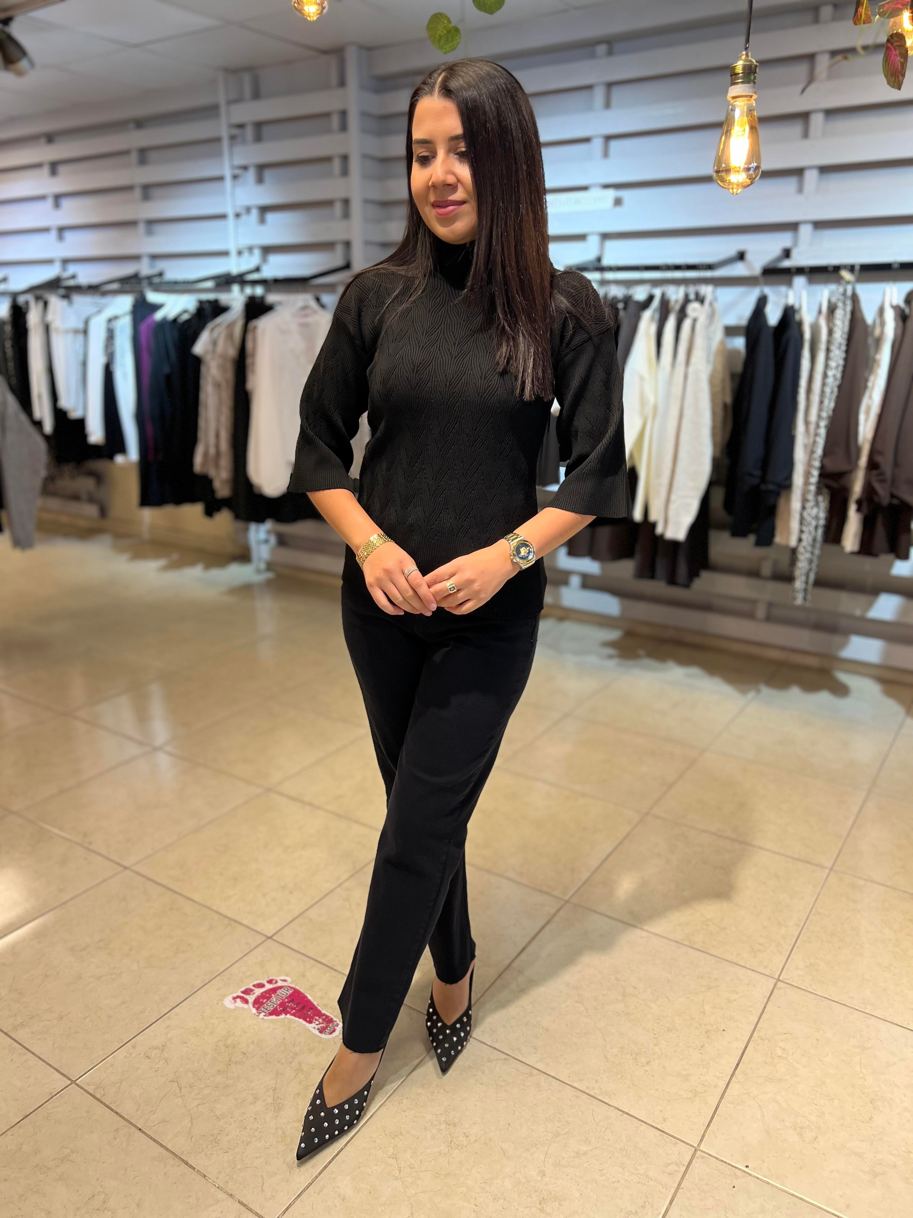 Ajurlu Yarım Balıkçı Triko Bluz Siyah