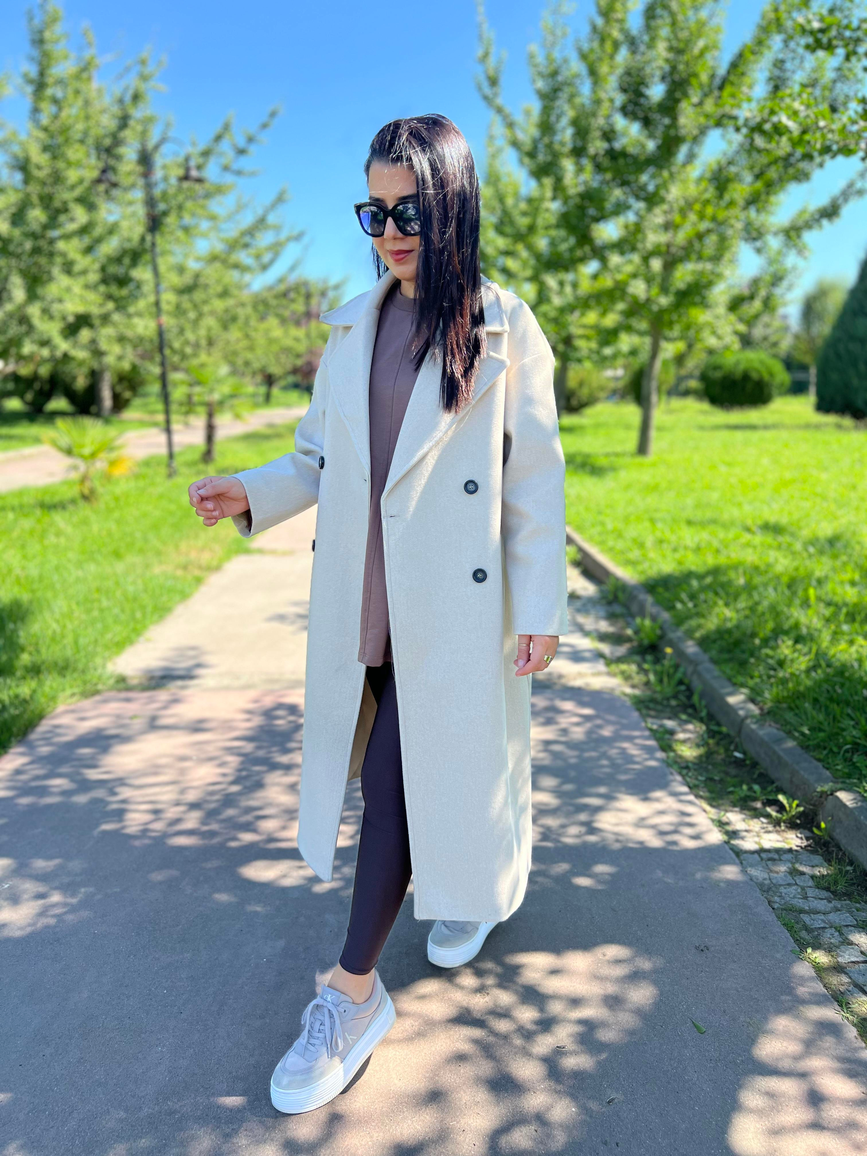 Düğmeli Oversize Kaşe Kaban Bej