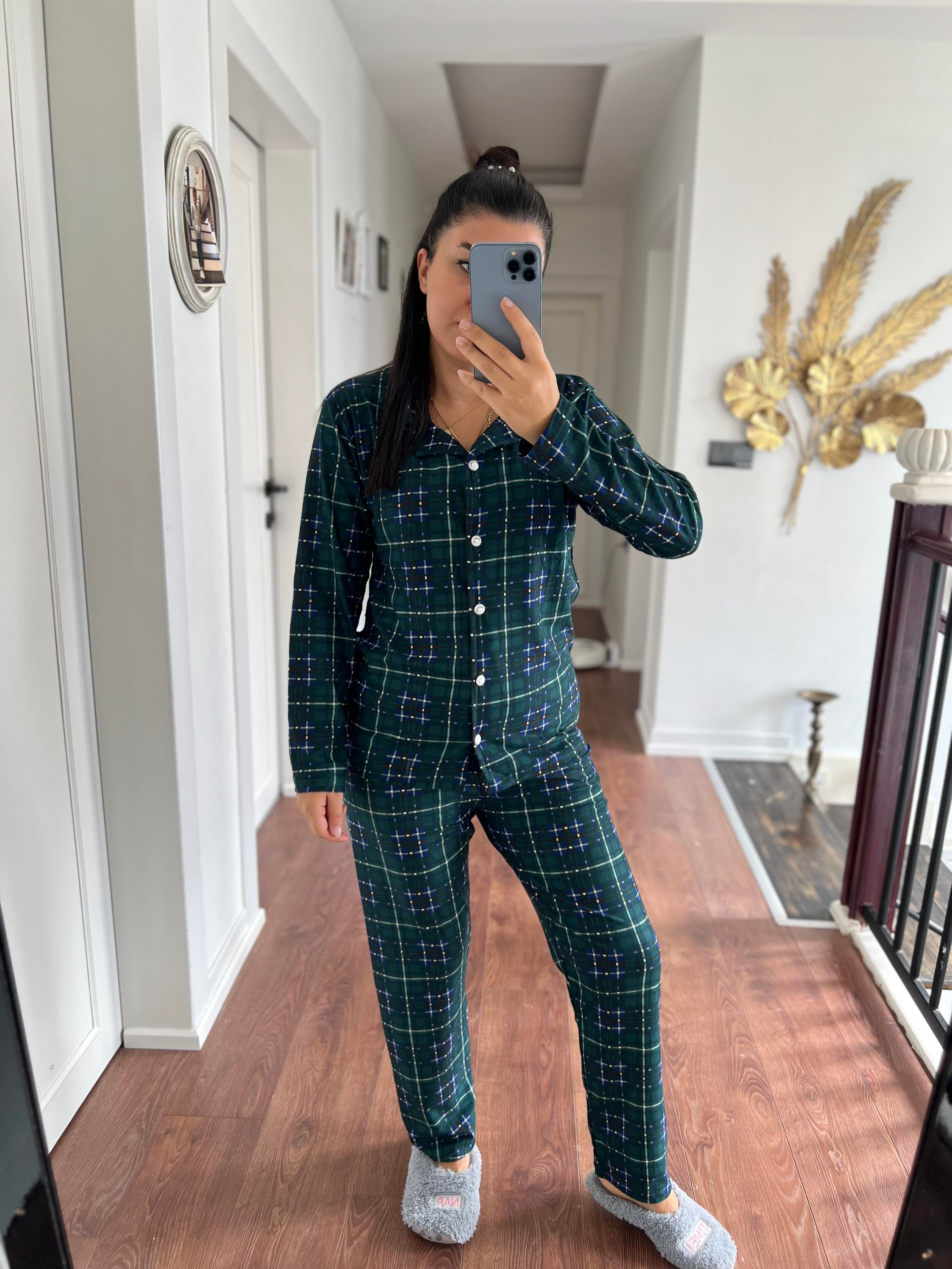 Düğmeli Süet Pijama Uzun Takımı Yeşil Ekose
