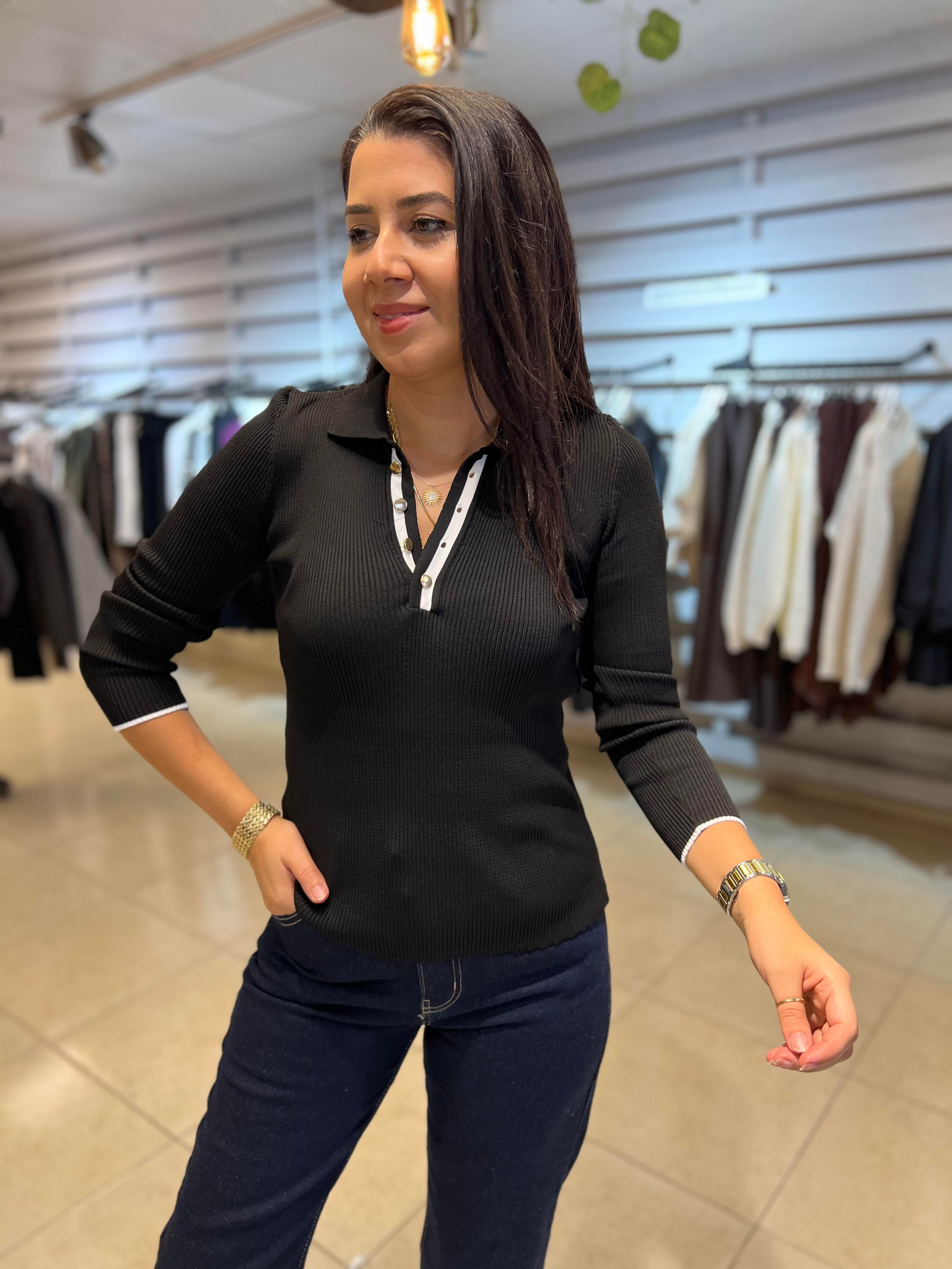 Polo Yaka Çizgili Triko Kazak Siyah (K220221)