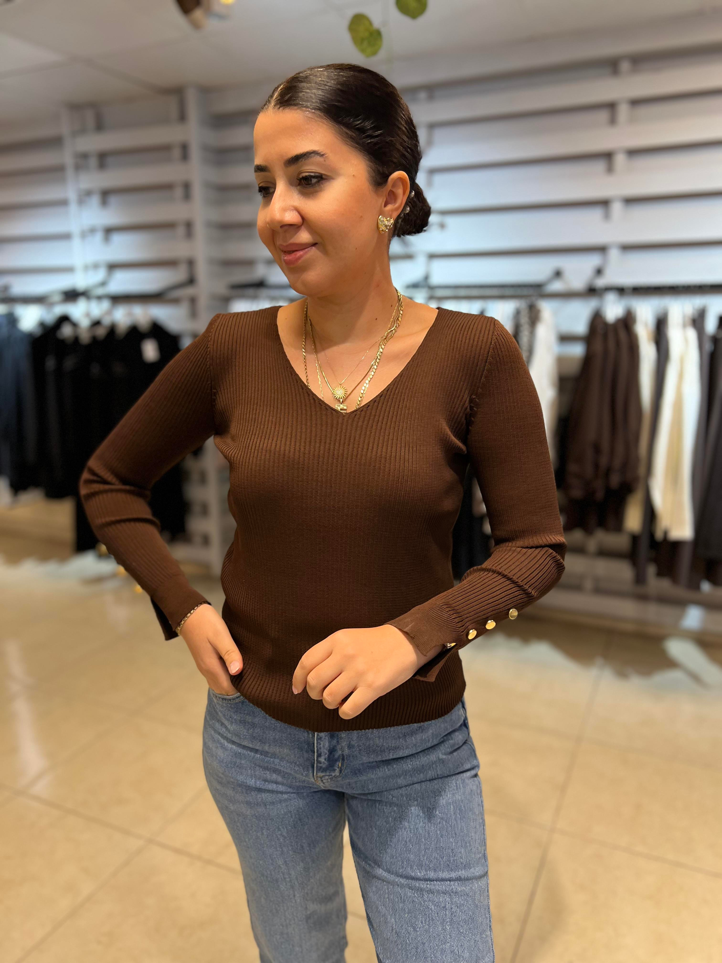 V Yaka Gold Düğmeli Triko Bluz Kahverengi