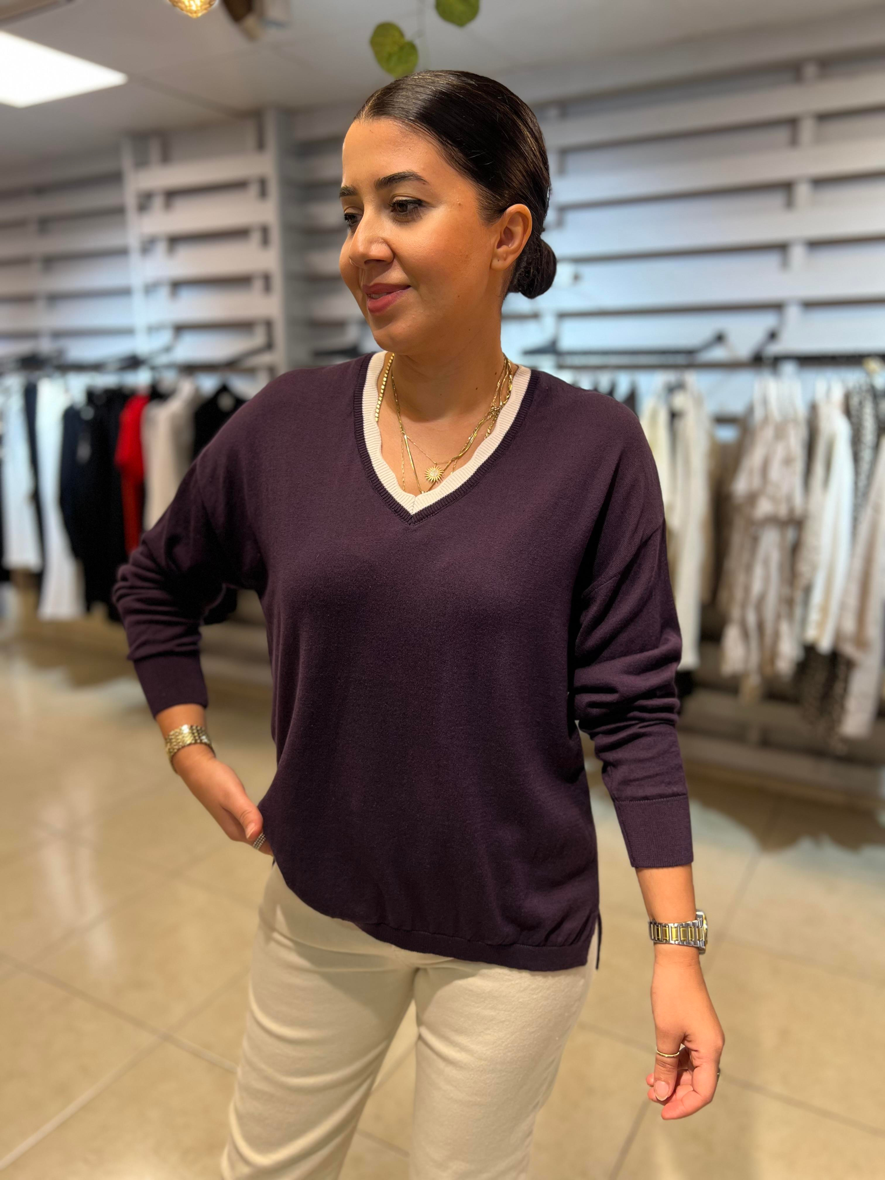 Yaka Çizgili V Yaka Pamuk Triko Bluz Mürdüm