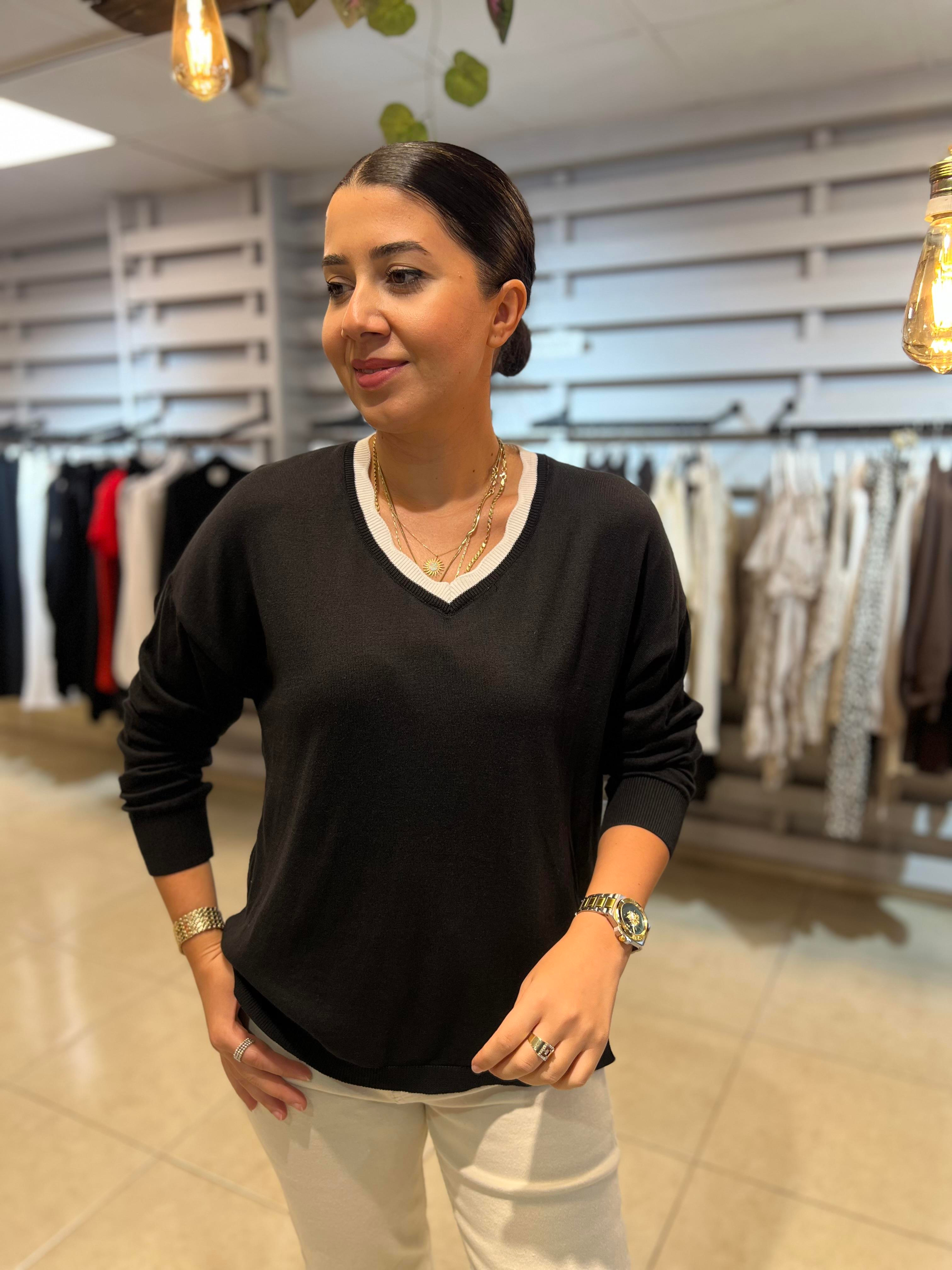 Yaka Çizgili V Yaka Pamuk Triko Bluz Siyah